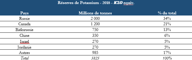 Canada, Biélorussie et Russie détiennent environ 2/3 des réserves de potassium