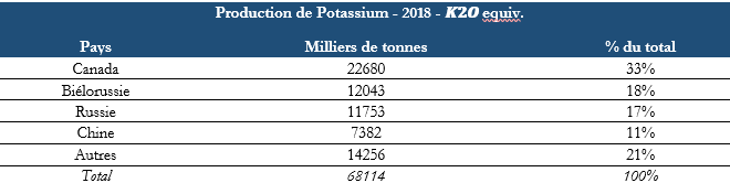 Canada, Biélorussie et Russie assurent environ 2/3 de la production de potassium
